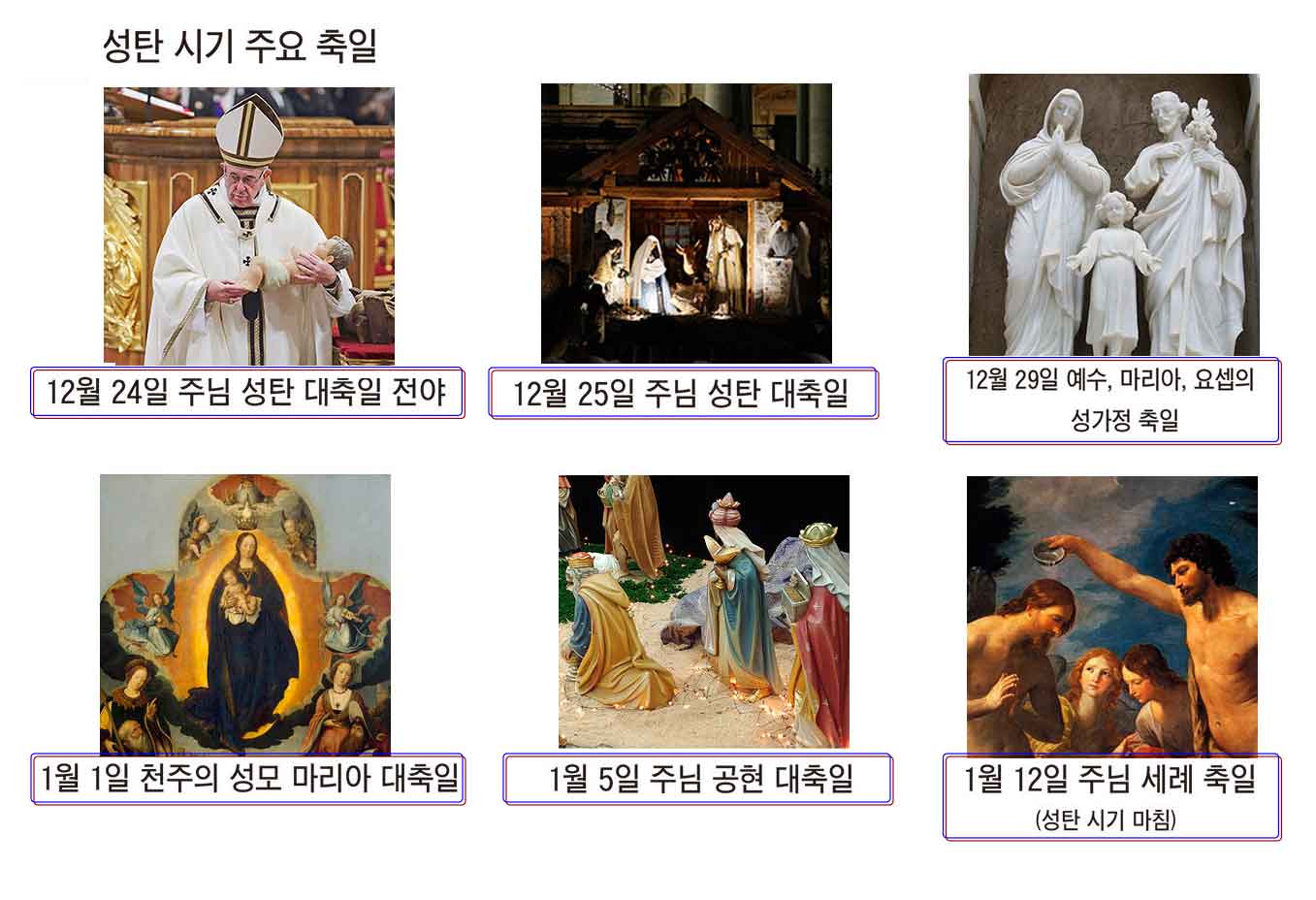 그리고 주님 공현 대축일(1월 6일 전후) 다음 주일에 지내는 주님 세례 축일까지로 공식적으로 성탄시기가 마무리됩니다. 즉, 주님 세례 축일이 끝나는 저녁 미사부터 새로운 연중 시기가 시작되므로, 성탄 시기의 길이는 대략 2주 정도로 비교적 짧은 편입니다. 하지만 이 기간 동안 교회는 한 주간의 ‘성탄 팔일 축제(12월 25일~1월 1일)’를 중심으로, 여러 성인 축일과 축제를 거행하며 구세주의 탄생 신비를 더욱 깊이 체험할 수 있게 됩니다.