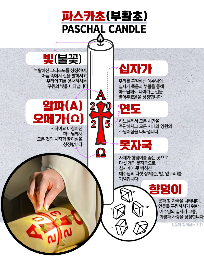 이 초에는 십자가와 알파(Α), 오메가(Ω), 그리고 해당 연도의 숫자를 새기며, 다섯 개의 향 덩이를 꽂아 예수님의 오상(五傷)을 기념합니다.