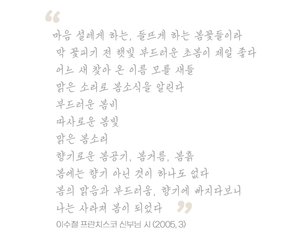 사순시기 전례시기와 너무 잘 들어맞는 요즘의 계절, 봄입니다. 강 같은, 봄 같은 파스카의 주님을 닮았으면 좋겠습니다.