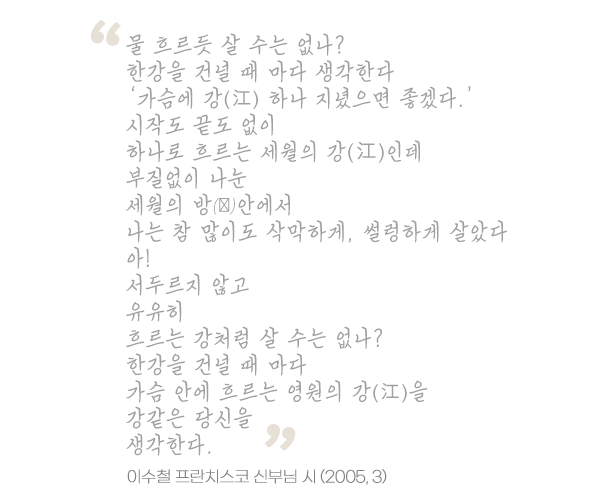 “어느덧 세월 흘러 봄이 돌아와 사십일 재계시기 다가왔으니, 교회의 신비로운 전통에 따라, 마음을 가다듬어 재계 지키세” 2005년 봄, 그러니까 19년 전 써놨던 시 두 편 나눔으로 강론을 시작합니다. 19년 동안 어머니를 비롯해 3분의 형님이 돌아갔고 많은 사랑하는 분들이 세상을 떠났습니다. 세월 흘러도 오랜만에 읽어보니 새롭습니다. 하나는 ‘한강을 건널 때마다’입니다. 이 때는 수도원 매각 문제로 참 어지러웠던 때이고, 힘들 때 좋은 시들은 구원의 빛처럼 저를 밝혔고 위로했고 자유롭게 했습니다.