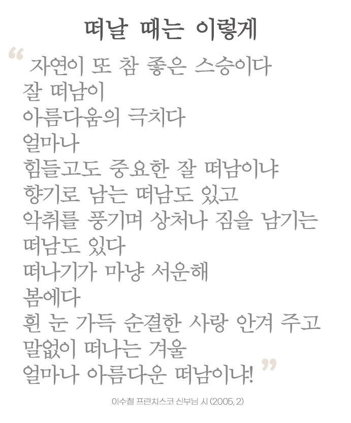 사람이 진실, 고결(高潔)하고 겸손하면 저절로 사람이 따른다는 것입니다. 참으로 잘 살았을 때, 잘 떠납니다. 삶과 죽음도 마찬가지입니다. 잘 떠날 때 일치와 평화의 선물을 남기지만, 그렇지 못할 때는 분열과 불화를 남깁니다. 늘 떠남을 준비하며 살아갈 때 하루하루 충실할 수 있을 것이며 떠날 때도 아름답게 향기처럼 떠날 수 있을 것이며 참으로 진실을 추구하는 누구나의 소망일 것입니다. 19년 전, 2005년 참으로 수도원이 어려운 일을 겪던 해 써놨던 “떠날 때는 이렇게”라는 시(詩)를 주일에 이어 최초로 공개합니다.