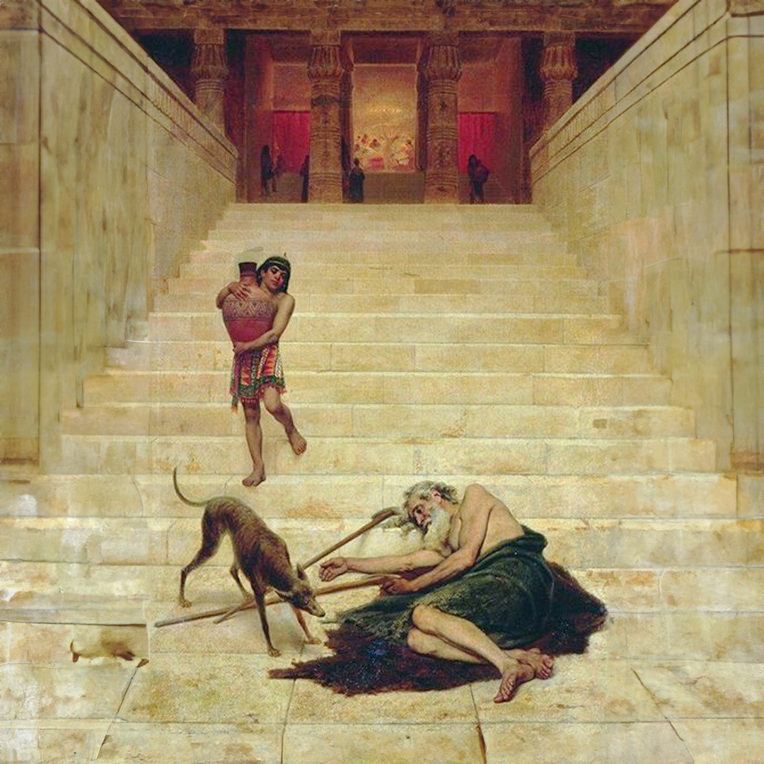 그의 집 대문 앞에는 라자로라는 가난한 이가 종기투성이 몸으로 누워 있었다. 그는 부자의 식탁에서 떨어지는 것으로