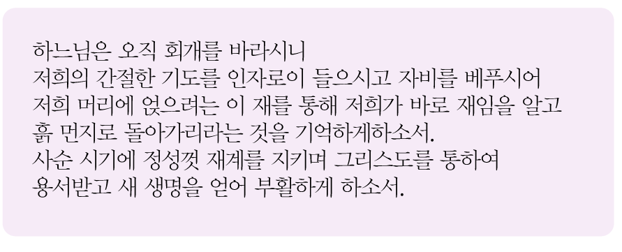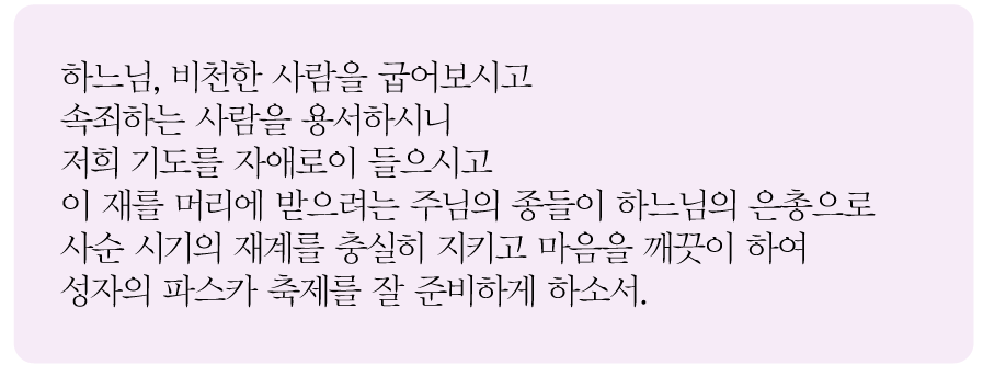 그리스도인의 마음을 정화하며 부활을 준비하는 사순 시기가 머리에 재를 없는 예식과 함께 시작되었습니다. 하느님과 소원하던 관계를 되돌아보고 주님과 화해하는 은혜로운 때입니다. 교회는 사순 시기를 지내며 유다인들이 늘 실천하였던 "의로운 일", 곧 기도와 단식과 자선을 진지하고 경건하게 실천하도록 권고합니다. 기도와 자선과 단식은 하느님과의 관계, 이웃과의 관계, 나 자신과의 관계 안에서 이루어지는 의로운 일을 뜻하는 것으로 보입니다. 기도로 하느님과 더 깊은 관계를 맺고, 자선으로 이웃에게 사랑을 베풀며, 단식으로 악습을 잘라내고, 쾌락을 절제하며, 자신을 이겨 내는 것입니다.