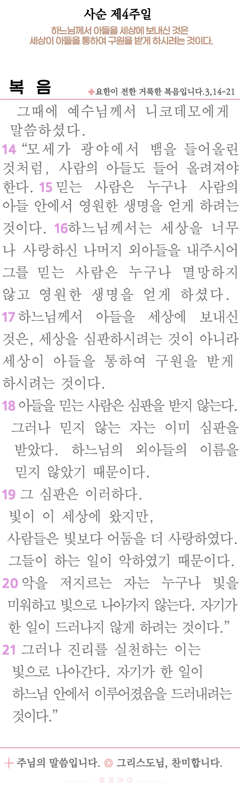 ✠ 요한이 전한 거룩한 복음입니다. 3,14-21