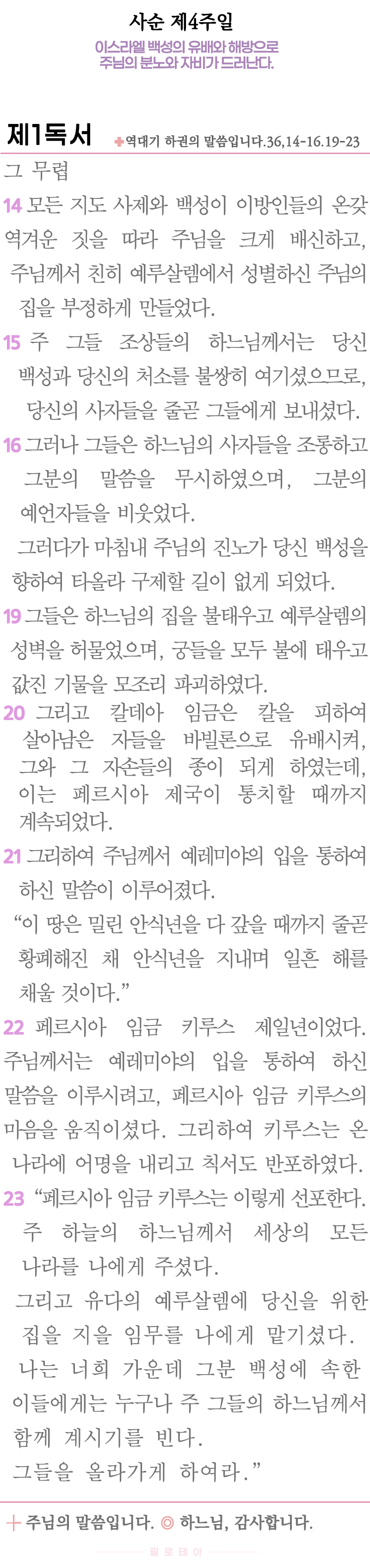 하지만 하느님께서는 그들이 그대로 멸망하도록 버려두지 않으시고 페르시아 임금 키루스의 마음을 움직이시어 이스라엘 백성의 해방을 선포하게 하십니다. 이처럼 제1독서는 하느님께 대한 불충으로 고난과 역경을 겪을지라도 결국에는 구원으로 이끄시는 하느님의 사랑과 자비를 전하고 있습니다.