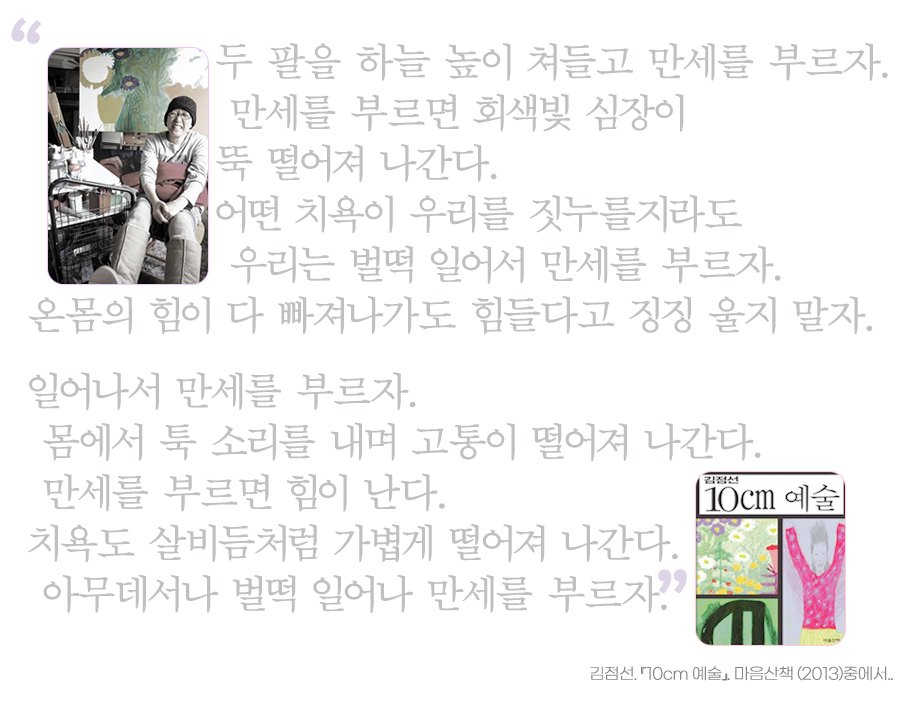 만세 부르기는 참 좋은 기도이자 운동으로 뇌졸중 예방에도 좋다합니다. 사실 몸과 마음을 다한 만세보다 절박한 기도도, 사랑도 없을 것입니다. 호기심에 "김점선" 이름을 검색해 봤더니, 1946년 출생, 2009년 3월 22일 별세. 홍익대 대학원 서양학과 졸업. 1년 365일, 하루 24시간 내내 그림을 그리고 싶어 잠자는 시간도 아까워했던 화가로 소개되어 있었습니다. 만 63세로 타계하기 전까지 참으로 치열하게, 가열하게 살았던 화가이자 시인이었습니다.