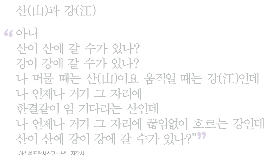 주고받은 대화에 즉시 떠오른 “산(山)과 강(江)”이라는 자작시에 만족했고 위로받았습니다. 이 또한 어진 마음의 표현이겠고 참으로 정주 영성의 절정이 아니겠나 하는 자긍심(自矜心)도 들었습니다.